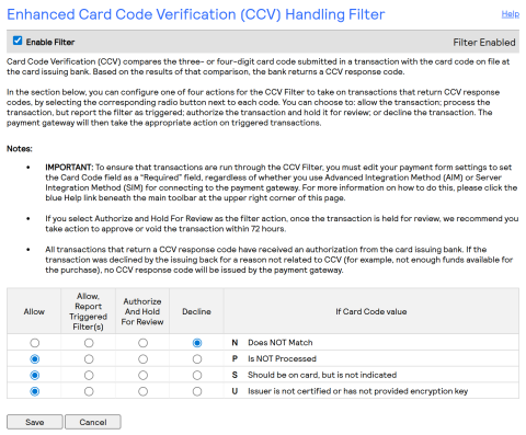 - Enhanced Card Code Verification (CCV) Handling Filter: Enable filter, decline N.