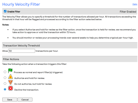 - Hourly Velocity Filter: Enable filter, 50 transactions per hour, decline transaction.