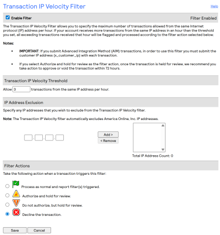 - Transaction IP Velocity Filter: Enable filter, 3 transactions per hour, decline transaction.