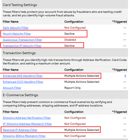 - Enhanced Address Verification Service (AVS) Handling Filter: Enable filter, decline N & A.