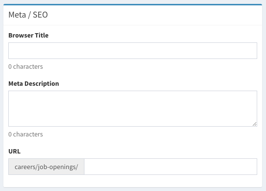 In the last section “Meta/SEO” the “Browser Title” and “URL” are auto-generated using the “Position” title from the top of the page.