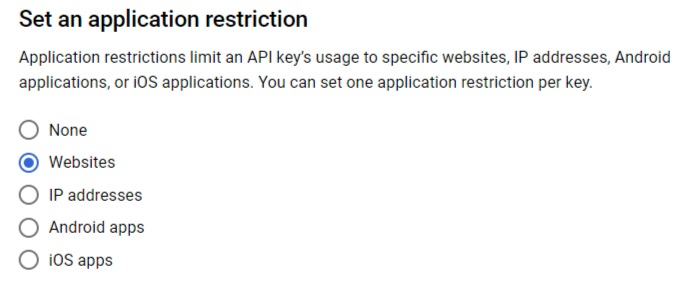 - Edit the API key settings and choose Website under Set an application restriction and then in the website restrictions type your domain like this *.example.com/*