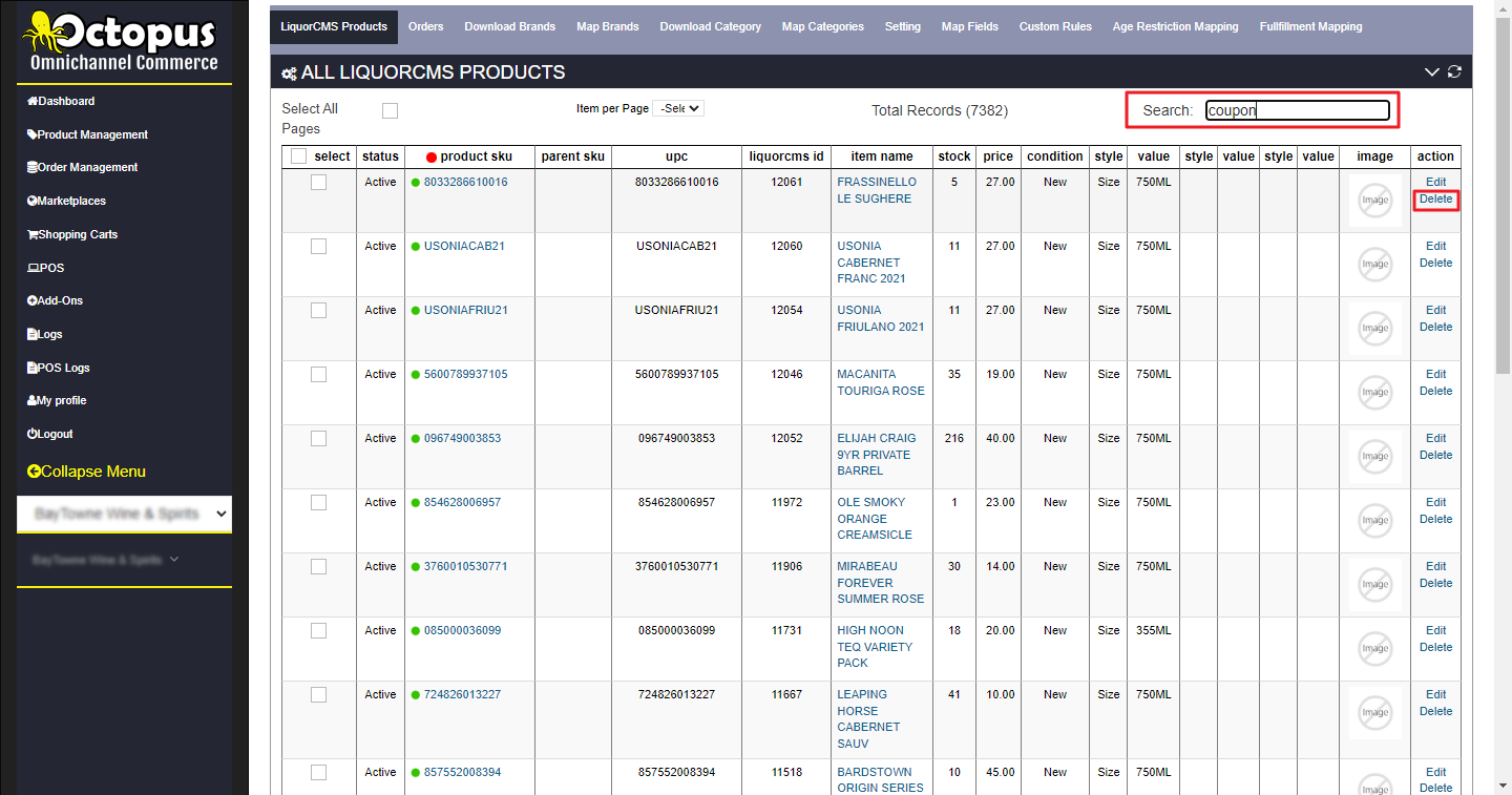 2. Find the item you want to delete by using the Search box on the upper right and once you find the item, click the DELETE button on the far right of that item.