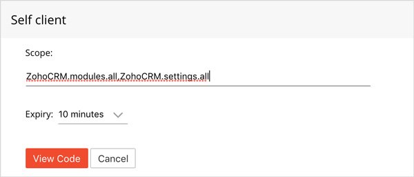 For the Scope enter: ZohoCRM.modules.all,ZohoCRM.settings.all